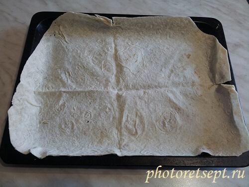 1. Лаваш разложить на противне. Края можно подрезать ножницами.