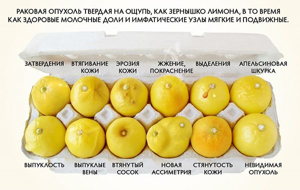 В подмышечной области с той же стороны могут пальпироваться один или несколько плотных подвижных лимфатических узлов округлой формы. В более поздних стадиях могут иметь место втяжение и фиксация соска, определяемая на глаз умбиликация кожи над опухолью, явления лимфостаза, т.е. симптом «лимонной корки