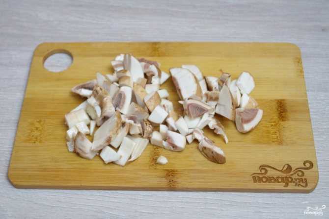 - Тщательно промываем грибочки, очищаем от грязи, пятен и обрезаем нижнюю часть ножки. Подсушиваем и мелко нарезаем.