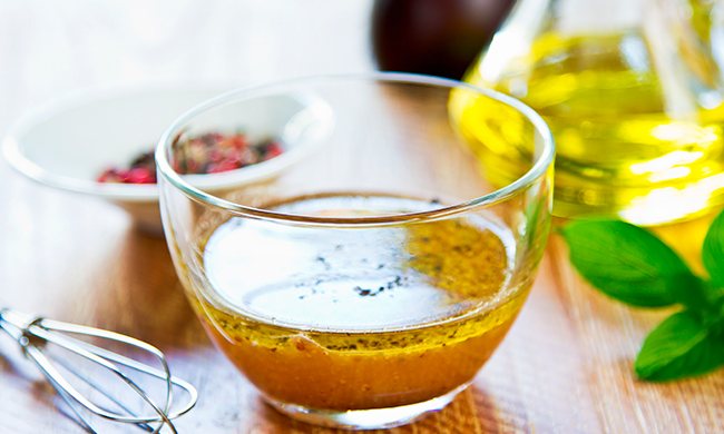 В нем соблюдается классическая пропорция – к трем частям масла одна часть уксуса. Это самый простой рецепт, при этом очень вкусный. Но мы сделаем более интересный вариант и добавим еще горчицу, немного базилика и мед.