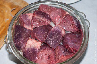 - Сердца разрезать на части, удалить из них все прожилки и сосуды, хорошо помыть. Затем поместить мясо в объёмную миску, залить холодной водой и оставить на 20-25 минут (чтобы избавиться от крови).