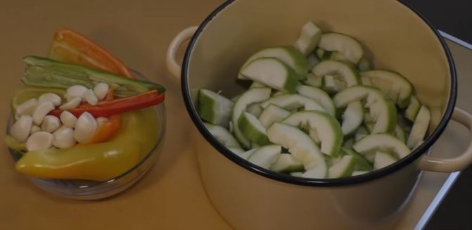 1. Кабачки очистите от кожицы. Если они перезрелые, то вырежьте сердцевину с семенами. Затем нарежьте их полукольцами. Перцы промойте и очистите от семян. Нарежьте их на дольки. Чеснок очистите от шелухи.