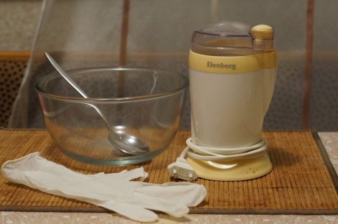 4) Стеклянная миска, ложка, кофемолка, медицинская перчатка. Кофемолку придется для таких дел покупать отдельно. Для кофе она после приготовления соли/бомбочек станет непригодна.