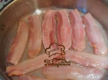 - Копченое сало, которое придаст блюду изысканный аромат и вкус, необходимо нарезать длинными полосками.