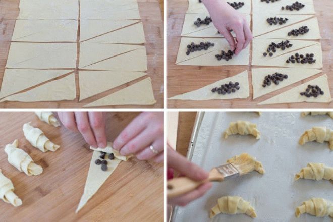 - Делают круассаны из слоеного теста с начинкой, применяя густое варенье, свежие или консервированные фрукты, шоколад, творог, вареную сгущенку.