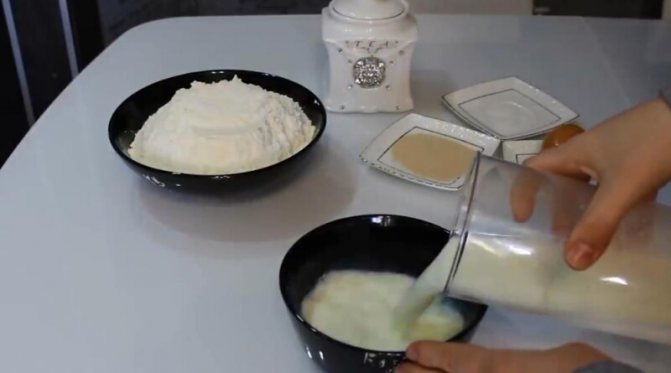- Всыпать часть просеянной муки, дрожжи и соль;