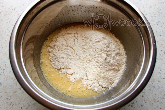 В яйца всыпаем щепоть соли и частями всыпаем муку.