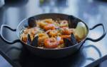 Мороженые очищенные креветки (20 штук размера 50/60) размораживают, обсушивают, и перемешивают с промытой черной фасолью из банки. Заправку готовят в блендере: смешивают масло рисовых отрубей (¼ стакана) с соком лайма (½ ст.л.), зеленым соусом табаско (1 ч.л.), молотым перцем чили и молотым тмином (по ½ ч.л.), нарубленной зеленью кинзы (1 ст.л.) и щепоткой соли. Половиной получившейся смеси заливают фасоль с креветками, и на час ставят в холодильник. Затем надо добавить нарубленный зеленый лук (1 ст.л.), кинзу (еще 1-2 ст.л.), болгарский перец, порезанный соломкой (1 шт.) и оставшуюся заправку, перемешать и сразу подавать.