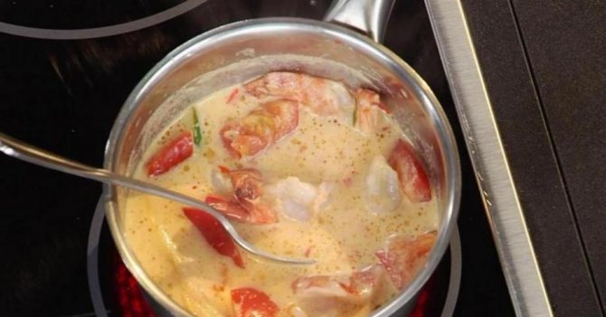 4. В кастрюле разогреть куриный бульон. Когда он закипит, добавить кокосовое молоко или сливки.