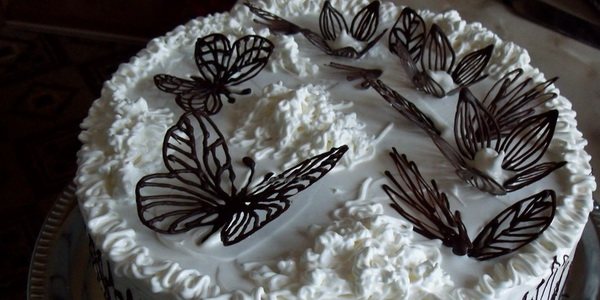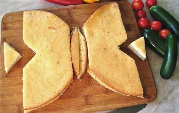 Чтобы сделать торт в виде бабочки, бисквит разрезают пополам. Затем аккуратно посередине разреза вырезают небольшие треугольники, то есть формируют крылышки. Затем коржи соединяют округлыми сторонами и промазывают кремом. Бабочку из коржей можно вырезать с помощью выкройки, которую делают из бумаги.