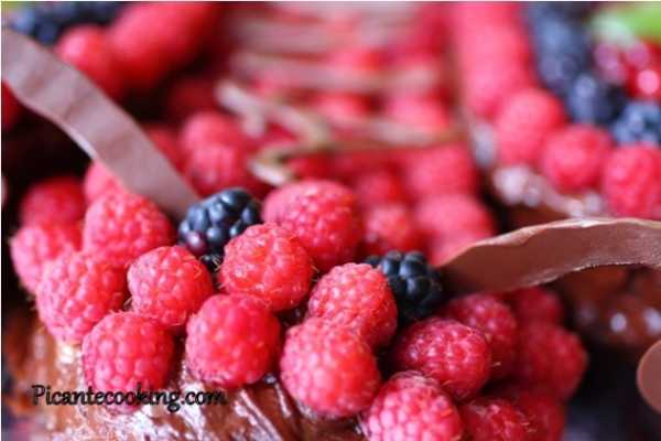 7) Смажьте срезы бисквита оставшимся шоколадным кремом. Поверх торта, выложите ягоды так, как вам нравится.