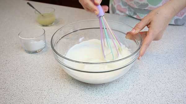 2. Белки взбить в устойчивую пену. Не прекращая взбивать, добавить лимонный сок и взбивать еще 1 минуту.
