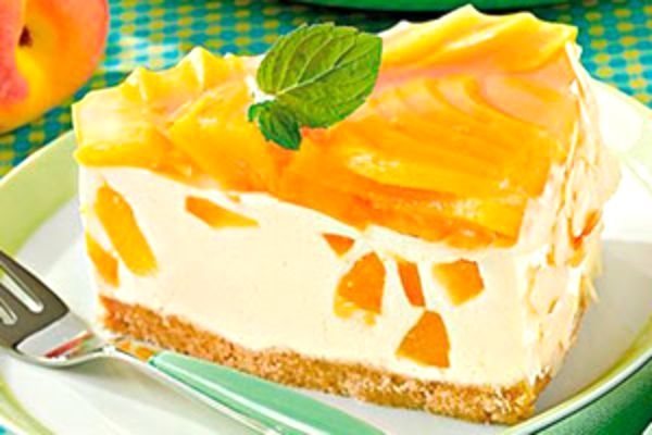 - Готовое блюдо остудите. На его поверхность выложите нарезанные персики.
