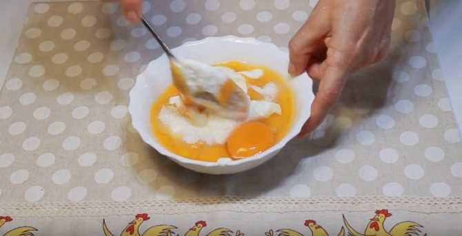 - Желтки сложите в плошку с творогом и йогуртом. Перемешайте до однородности массы.